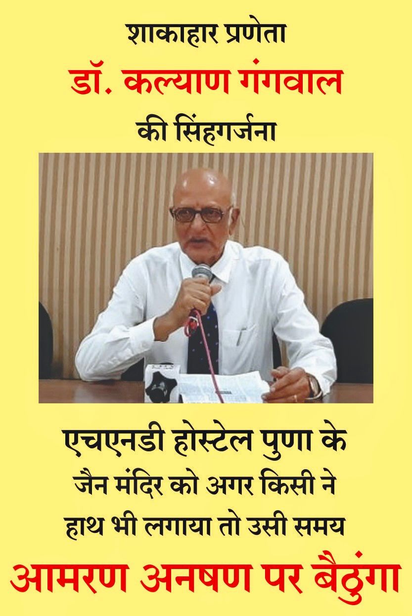 अनेक पुरस्कारों से सम्मानित शाकाहार के प्रचार में अपना तन मन धन समर्पित करने वाले शाकाहार प्रचारक डॉक्टर कल्याण गंगवाल पुणे ने आमरण अनशन की चेतवानी दी है।