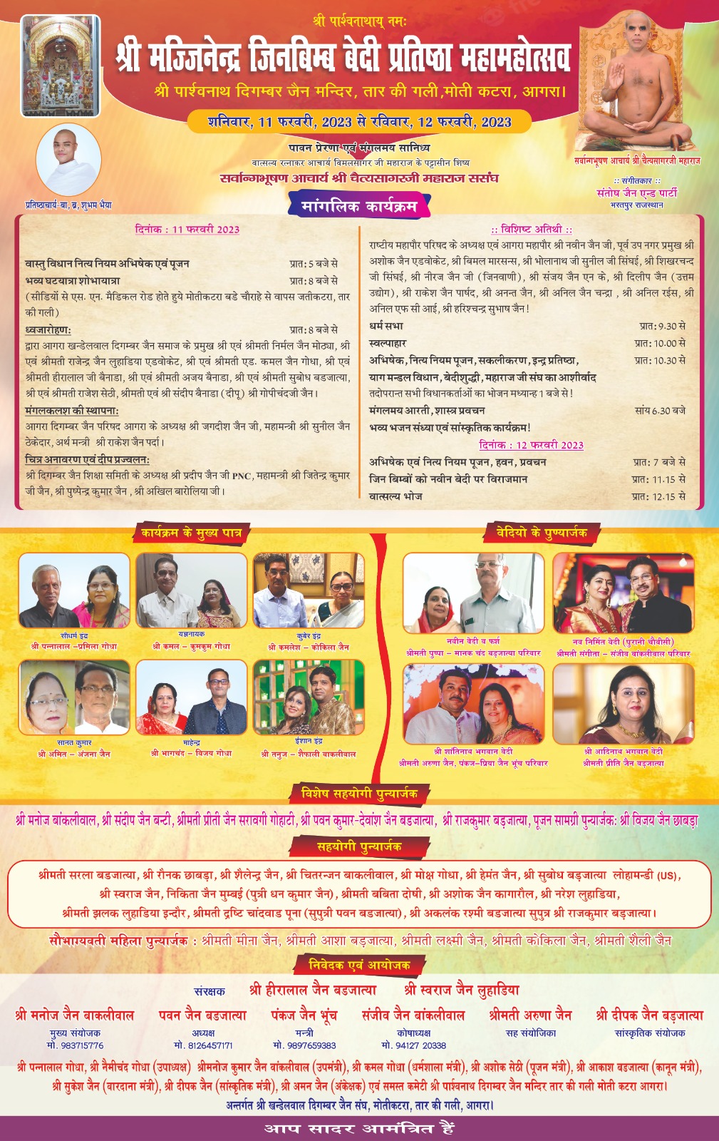 मनुष्य जीवन बहुत दुर्लभ होकर कठिनाई से मिलता हैं श्रावक श्राविकाओं को दर्शन पूजन आदि कर जीवन की उन्नतिशील बनाने का पुरुषार्थ करना चाहिए। जब संघ ने प्रवेश किया था तब प्रवेश में आपकी भक्ति उत्साह भी भगवान का अतिशय है पंच कल्याणक हेतु पात्र अनेक राज्यों से बने हैं श्री मनोज जैन सोगानी अनुसार आचार्य श्री के प्रवचन के पूर्व श्री मज्जिनेन्द्र जिन बिम्ब पंचकल्याणक प्रतिष्ठा महोत्सव अंतर्गत प्रातः 7:00 बजे -नित्याभिषेक पूजन कर नए मंदिर जी में प्रातःअस्थायी जिनालय से भगवान को नवीन जिनालय में जुलूस द्वारा भक्ति भाव से लेकर सभी प्रतिमाओं की अभिषेक शांतिधारा कर नवीन जिनालय में वास्तु विधि ,चतुर्दिक हवन सभी पात्रों द्वारा किया गयापूज्य आचार्य भगवन के मंगल आशीर्वचन के बादआचार्य संघ की आहार चर्या हुई।दोपहर को प्रतिष्ठाचार्य पंडित मनोज के निर्देशन में मंडप में वास्तु विधि ,.शांति होम विधि ,दिक्पालार्चना सभी पात्रों द्वारा की गई ।इसके पश्चात सभी पात्रों की मेहँदी ,भक्ति संगीत के साथ चंद्रपुरी नगरी प्रांगण में लगाई गई शाम को नवीन जिनालय में श्री जी की आरती के बाद पूज्य आचार्य श्री वर्धमान सागर जी की आरती संत भवन में हुई। रात्रि में शास्त्र प्रवचन के बाद मंगल भक्ति गीत ,विनतियों का कार्यक्रम नवीन जिनालय में समर श्रीमति पूर्वा कंठाली जी इंदौर सौधर्म इन्द्र परिवार के द्वारा होकर प्रभावना वितरण किया गया। पंडित श्री मनोज शास्त्री के अनुसार 28 नवंबर को प्रातःधट कलश यात्रा ,ध्वजारोहण, मंडप उद्घाटन पंडाल ,भूमि शुद्धि ,चित्र अनावरण, दीप प्रवज्जलन किया गया।आचार्य के प्रवचन के बाद सभी पात्रों का सकली करण, विधान की पूजन गर्भ कल्याणक की क्रियाएं, रात्रि में 16 सपनो का नाटकीय मंचन होगा।