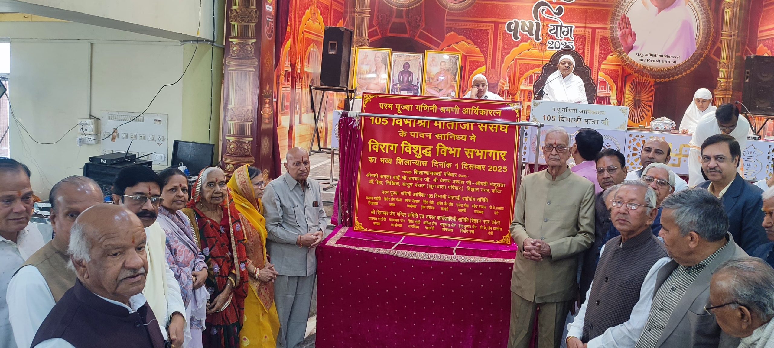 कोटा। विज्ञान नगर स्थित दिगंबर जैन मंदिर में प.पू. गणिनी आर्यिका विभा श्री माताजी ससंघ के सान्निध्य में विराग–विशुद्ध–विभा सभागार का शिलान्यास रविवार प्रातः 9 बजे सम्पन्न हुआ। मुख्य शिलान्यास कमला बाई, रूपचंद जी एवं चेतनप्रकाश जी बंसल परिवार द्वारा किया गया। कार्यक्रम में बड़ी संख्या में समाजजनों ने भाग लिया।