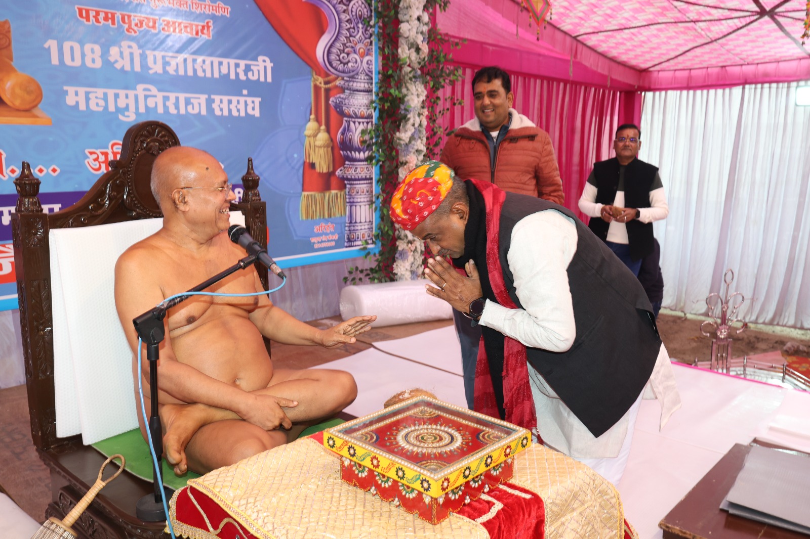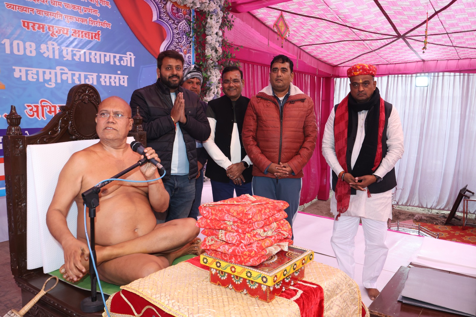 धर्म सभा में आचार्य पुष्पदंत सागर महाराज का चित्र अनावरण व आचार्य प्रज्ञा सागर महाराज के पाद प्रक्षालन का सौभाग्य नेमिनाथ मंदिर के अध्यक्ष ज्ञान चंद सुनील कुमार जैन ज्वैलर्स परिवार ने प्राप्त किया ।प्रातःकालीन जिनाभिषेक ,नित्य नियम पूजा शान्तिधारा आचार्य श्री के सानिध्य में किया गया ।