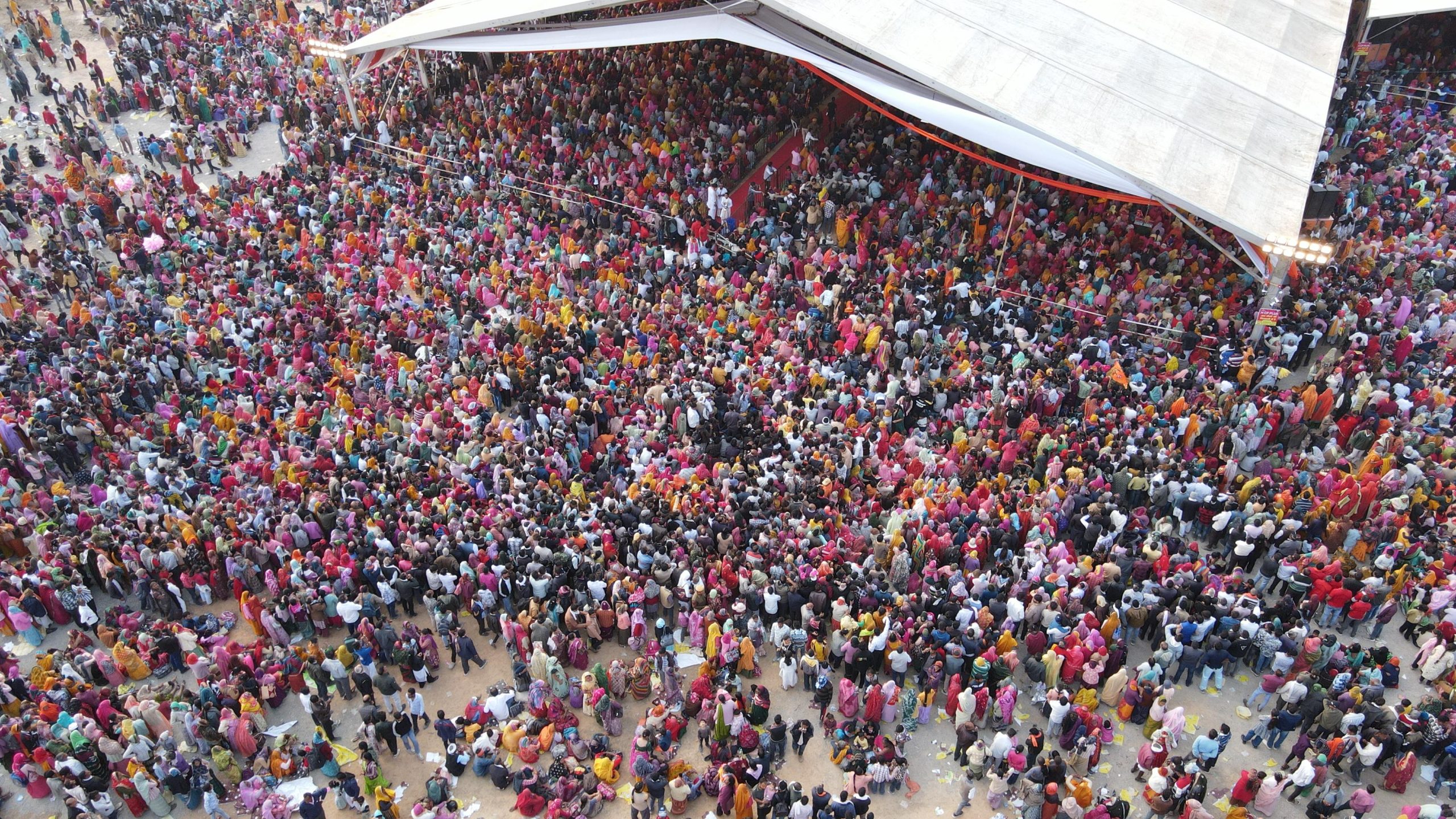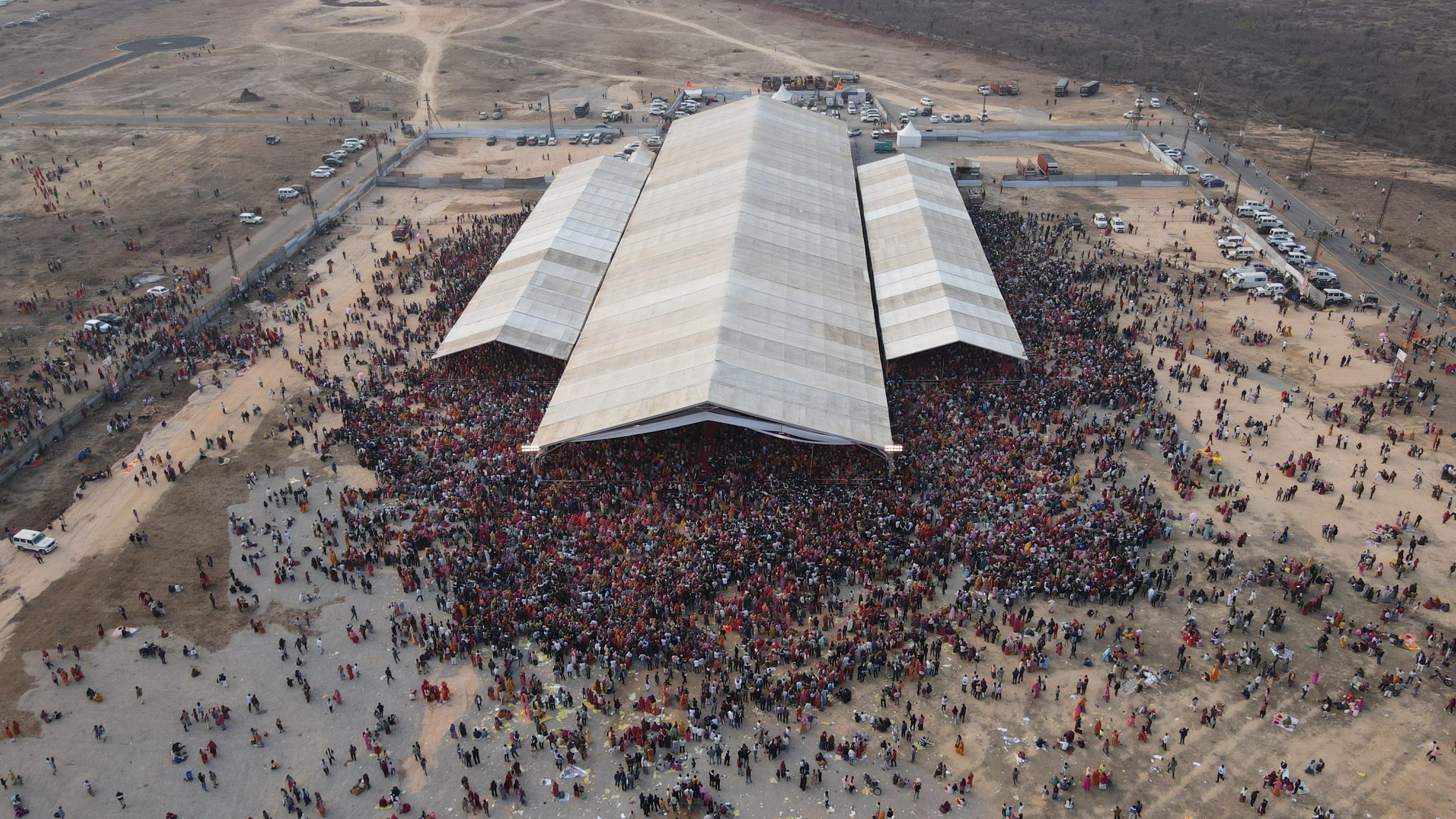 उधर पंडाल में भी लोग खचाखच भर गए! मंच के सामने बनाए गए तीन विशेष डोम मैं तो पैर रखने की जगह थी ही नहीं! डोम के बाहर से भोजनशाला के बीच तक खुले मैदान में भी लोगों का सागर उमडपड़ा!