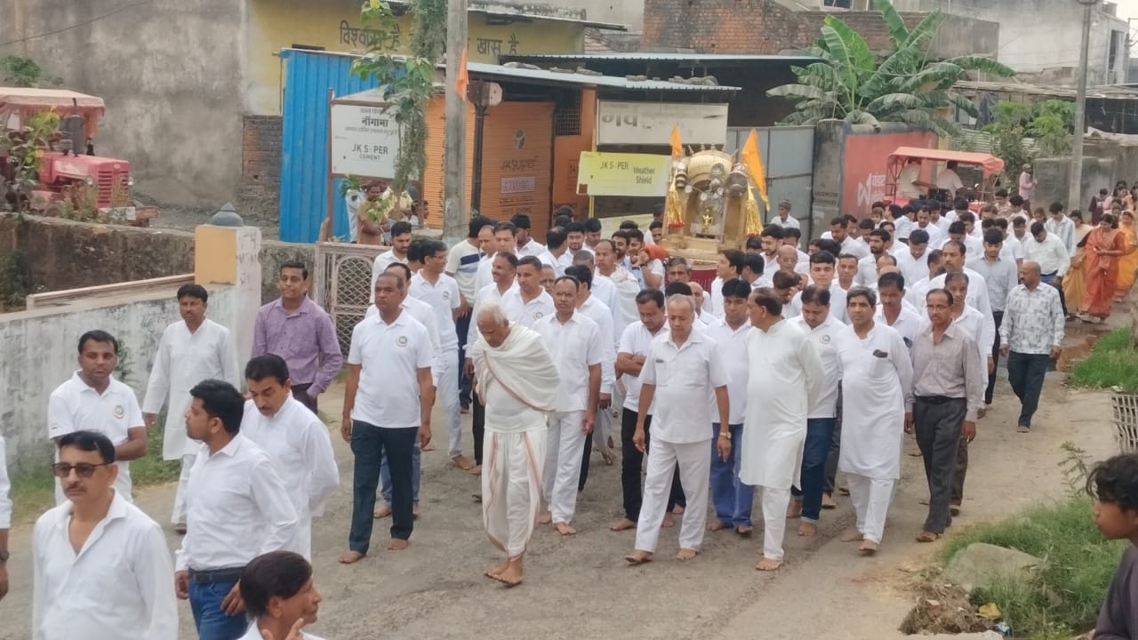 अभिषेक के पश्चात भगवान महावीर स्वामी की प्रतिमा विमान में विराजमान कर बैंड-बाजों के साथ विशाल शोभायात्रा नगर भमण में निकली। शोभायात्रा में पुरुष सफेद वस्त्रों में एवं महिलाएं केसरिया परिधान में शामिल हुईं। श्रद्धालुओं ने “भगवान महावीर स्वामी की जय” के जयघोष के साथ गरबा नृत्य करते हुए जैन पाठशाला के छात्र जैन धर्म ध्वज लहराते हुए नया बाजार मोहल्ला होते हुए भगवान महावीर समशरण मंदिर पहुंचकर भक्ति भाव से नृत्य प्रस्तुत किया।